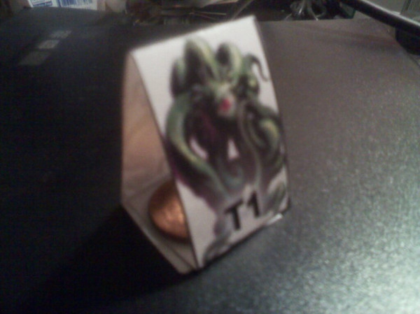 After they are cut and folded, since it was the only thing I had lying around I used a penny to give it some weight, and the result is the above image. Afterwards, I realized that nickels are slightly heavier and still fit, while the Large markers will use quarters or something bigger like dice.