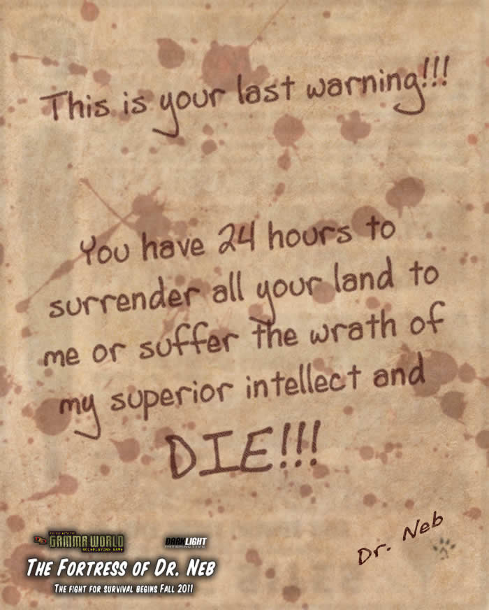 - The Fortress of Dr. Neb (Gamma World 4e level 2 encounter) - To be released Fall 2011